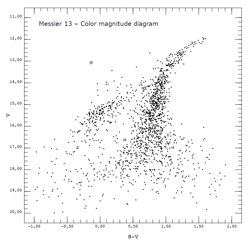 Color-magnitude diagram B-V versus V derived from high-resolution imaging of Messier 13, taken with a 8" telescope and Canon DSLR. Note the increasing magnitude errors towards faint stars at detection level around V=19. An error of 1.0 mag reflects an uncertainty of a factor 2.5 in flux (brightness). This statistical error results from of having counted few photon events, that is (intrinsic) naturals photon noise.