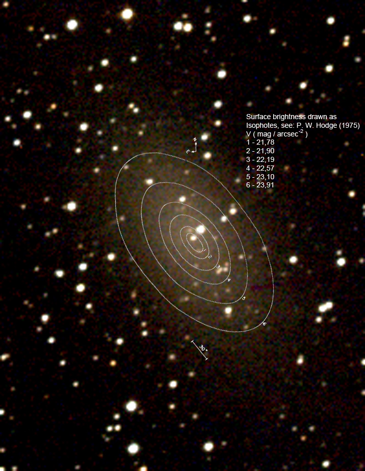 The reason why NGC 147 appears that faint is its extraordinary low surface brightness. The galaxy spans an area of around 14x8 arcminute at the sky. The stellar content is sparse. A handful of globular clusters have been identified and the brightest stars are found at 22 Vmag (Yang & Sarajedini, 2010). The dimension of NGC 147 is very similar to many other well-known deep-sky objects. But, illumination values found for common bright deep-sky object sometimes will cheat. The average surface brightness of NGC 147 can be computed from its total brightness divided by the area it spans. Using the total brightness of 10 Vmag, an average value of 23 Vmag per square arcsec is computed. This is much less than the sky level detected with a typical observing site. Expressed in numbers the sky brightness at a typical suburban amateur site is given with 19 Vmag arcsec-2. The illumination level of the galaxy is 4 magnitudes smaller than the black sky portion. This is 1/40 or 2.5 percent of the sky illumination level. Quite a challenge even for the experienced astrophotographer! Hodge (1976) measured surface brightness of NGC 147 and gave us an impression how the surface brighness drops from the center of the galaxy to the outer regions. The plotted isophotes, portions of nearly the same brightness are drawn in his work. In fact the surface brightness drops from around 21 Vmag arcsec-2 to nearly 24 Vmag arcsec-2 towards the outer regions of the dwarf galaxy NGC 147.