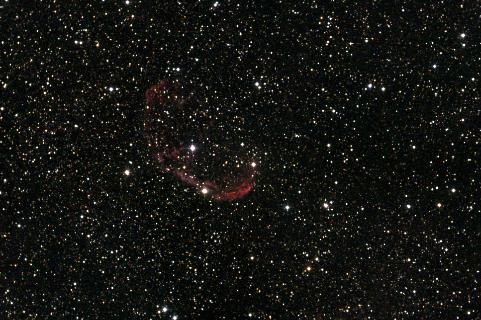Unfortunately, NGC 6888 is one of those famous objects on the night sky which are left out in the Vixen Starbook database of celestial objects. However, with a careful adjustment of the Sphinx SXD telescope mount and manual input of the celestial coordinates of NGC 6888 at the Simbad database, it is possible to take pictures of the nebula. With an exposure time of only 2 minutes per raw frame the nebula did not appear on the display monitor of the camera. Thus, the pictures have been taken blindfolded and processed later.