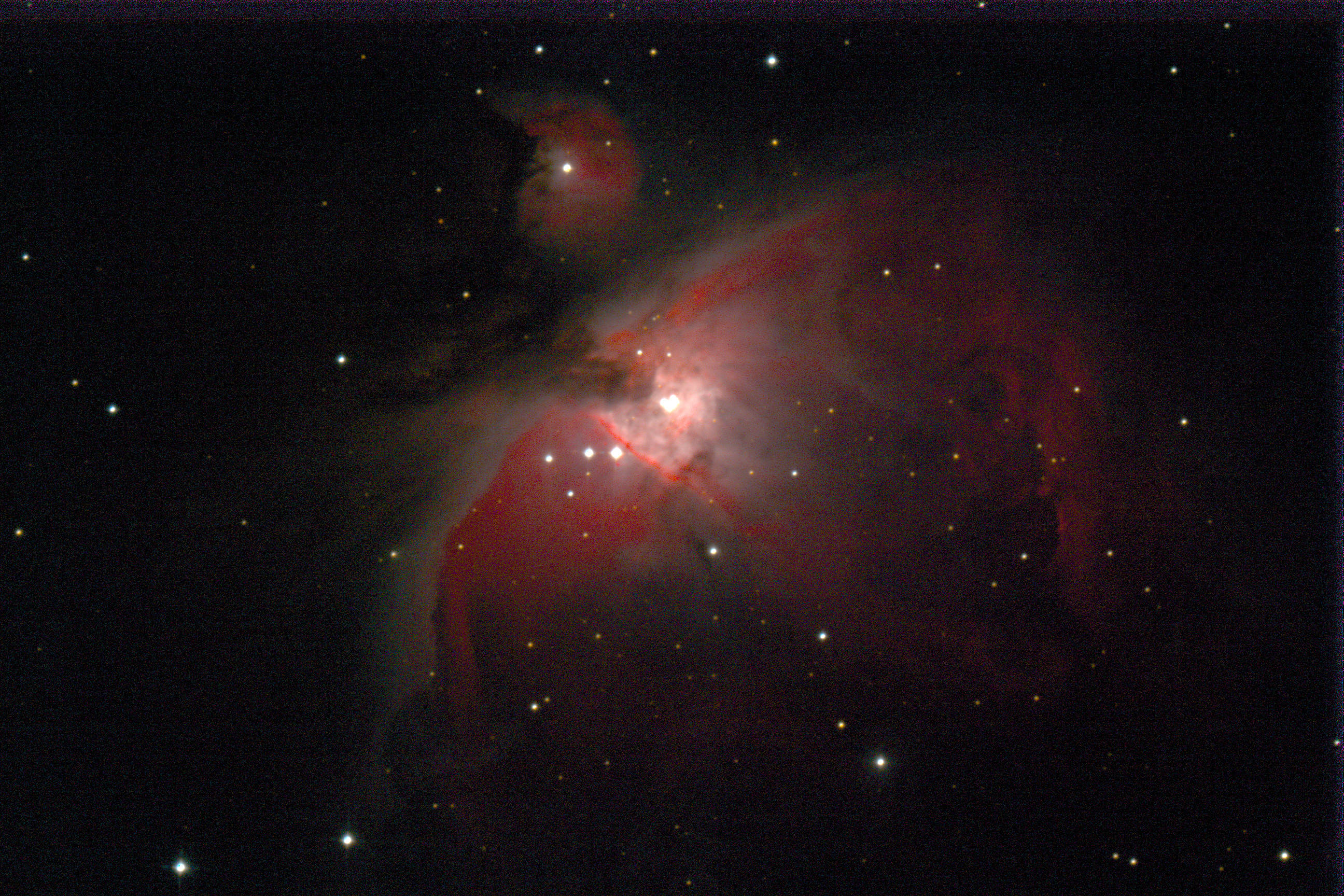 The great Orion Nebula (Messier 42, NGC 1976) is not simple to observe. Seeing and atmospheric diffraction cause small stellar "spectra" instead of spot images. This can be corrected with special software. Standard tools, like Photoshop, are overstrained with the enormous range of the intensity distribution in the image. Image intensities were stretched with a cubic function.