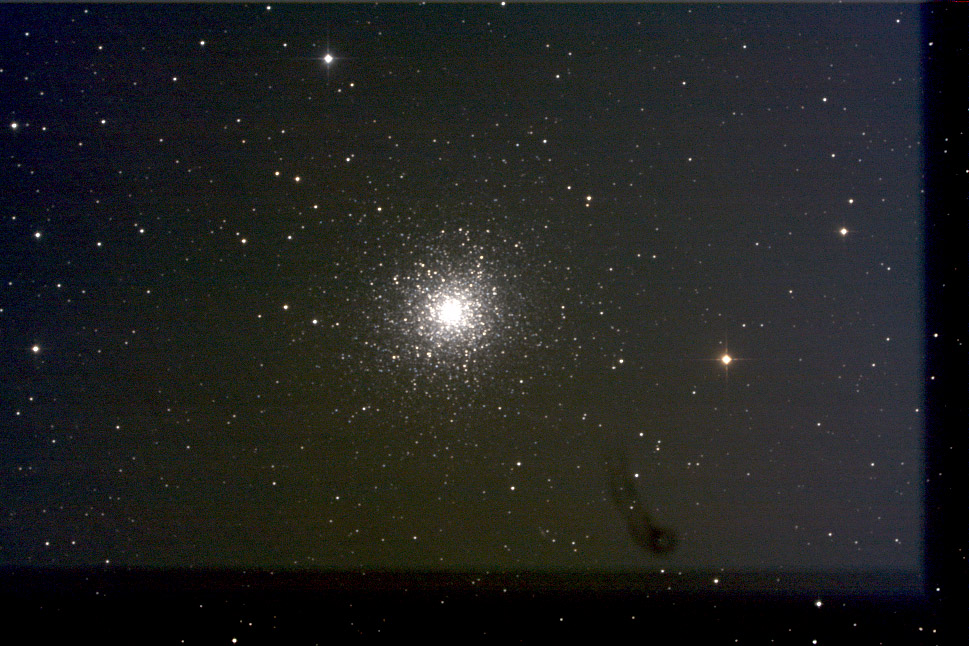 Fig. 1: Image of M13 taken two days before full moon. The result shows strong background illumination and a certain color gradient. Click to enlarge.