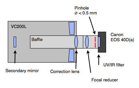 Fig. 2: Schematic view of the pinwhole camera used with the VC200L and DSLR camera. A plastic or aluminum chip with a pinhole is placed in the objective mount in front of the camera and filter. Click to enlarge.