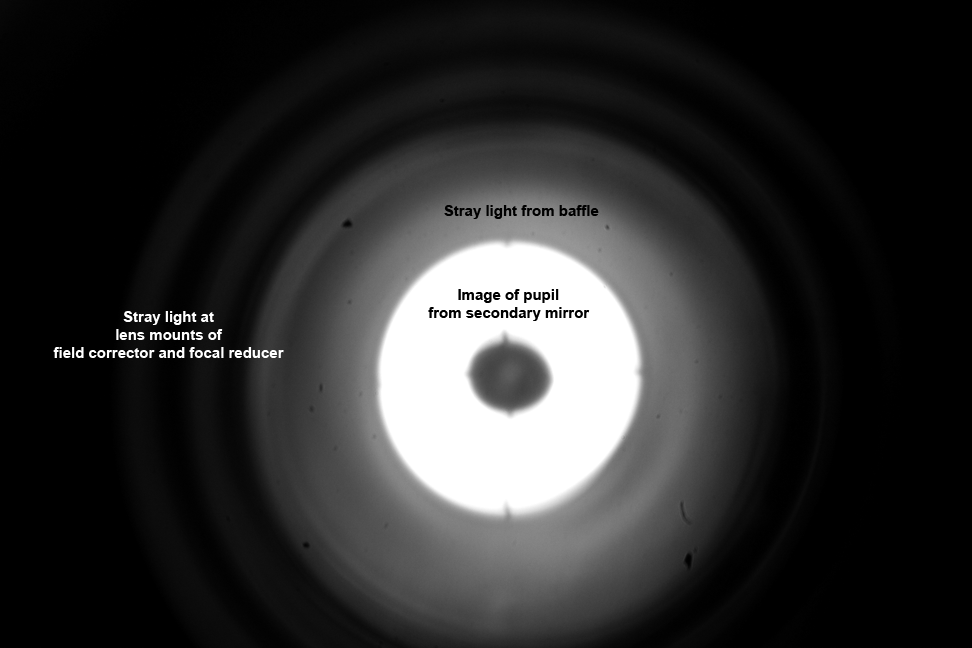 From the image obtained, one finds typical sources of scattered light, which will occur in the baffle of the Cassegrain telescope. The stray light is introduced from the painting of the baffle. Stray light is also introduced from the lens mounts of the field corrector and focal reducer of the Cassegrain telescope.